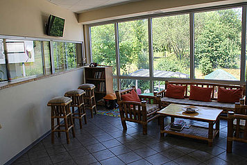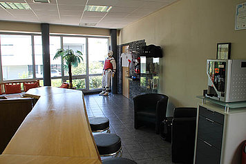 Da eine Fensterwand den Unterrichtsbereich vom modern eingerichteten Aufenthaltsraum trennt, ist es möglich den Schülern bei ihren Übungen zuzuschauen.