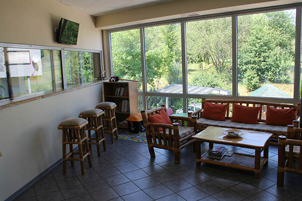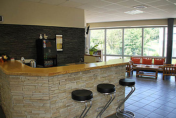 Die aus Stein gebaute Empfangstheke bietet das perfekte Ambiente, um auch vor und nach dem Unterricht gemütlich beisammen zu sitzen.